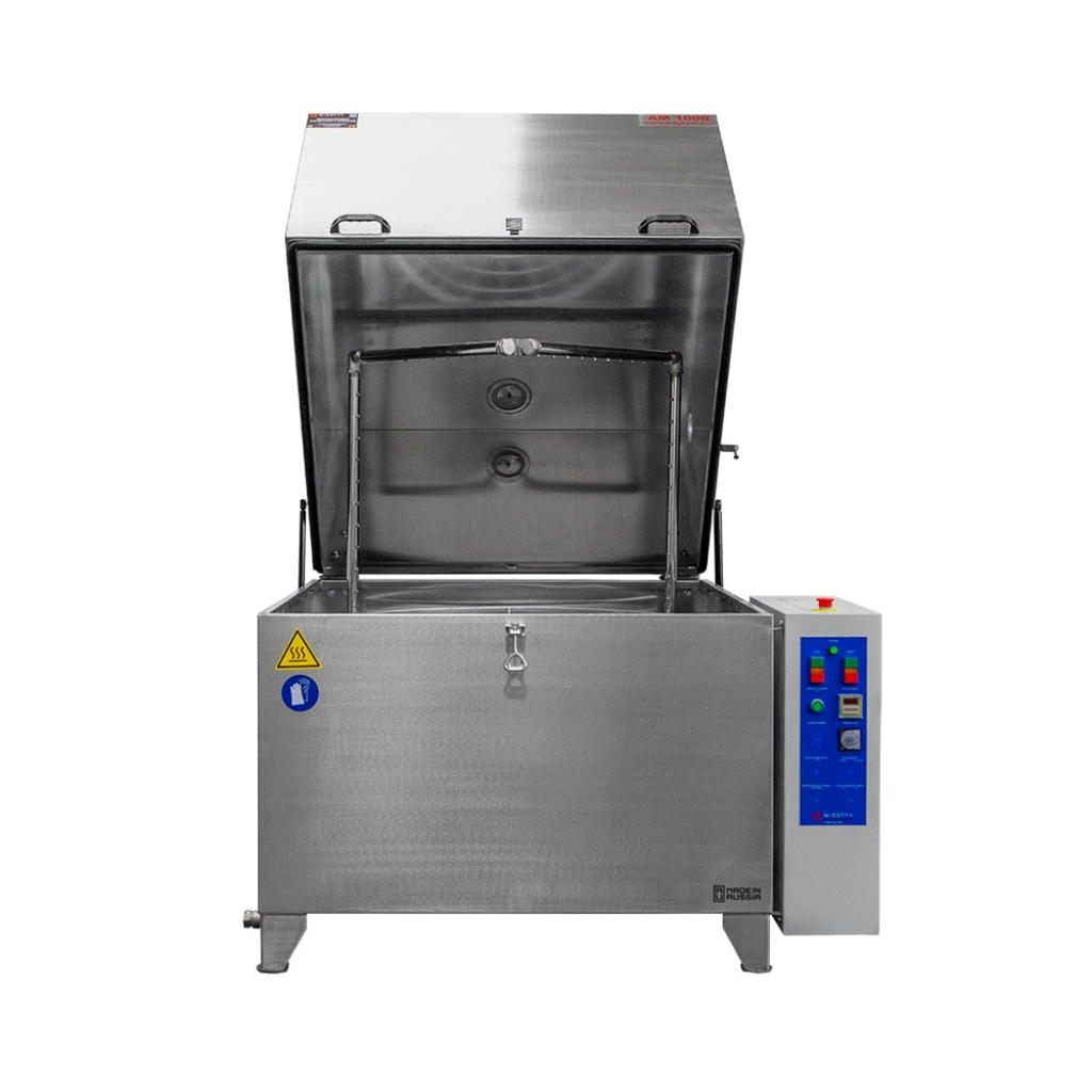 Температура и продолжительность цикла обработки задается на панели управления. Вращение корзины обеспечивает необходимое позиционирование деталей перед коллекторами. Парная П-образная форма рамп позволяет промывать изделия сверху, снизу и сбоку в течение заданного времени. Автоматические промывочные установки серии АМ предназначены для использования со слабощелочными растворами. Для наполнения бака используется обычная водопроводная вода.