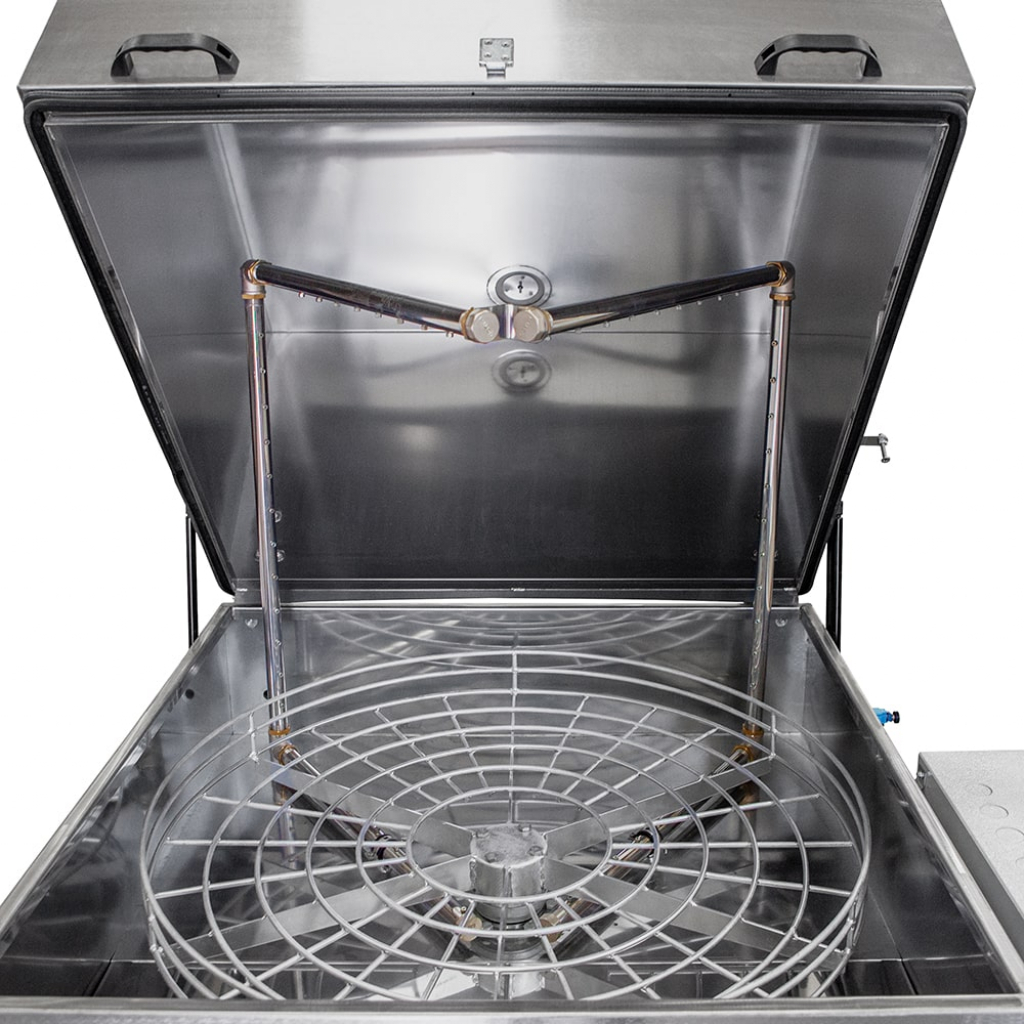 Линейка комплектуется двумя видами привода движения корзины – струйным и электромеханическим. При использовании электромеханического привода, корзина с деталями вращается равномерно с частотой 5-10 об/мин. Это обеспечивает высокое качество очистки, за счет равномерной подачи моющего раствора по всей поверхности деталей. Электромеханический привод является наиболее эффективным решением. Струйный привод накладывает ряд ограничений на эксплуатацию машины, такие как равномерное распределение изделий по весу в корзине, достаточную площадь поверхности деталей, соблюдение угла наклона.