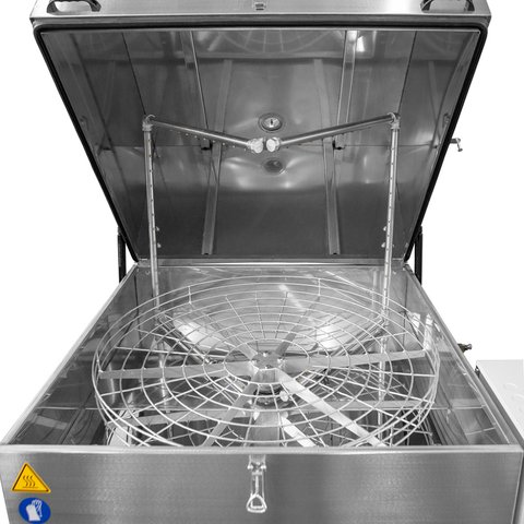 Температура и продолжительность цикла обработки задается на панели управления. Вращение корзины обеспечивает необходимое позиционирование деталей перед коллекторами. Парная П-образная форма рамп позволяет промывать изделия сверху, снизу и сбоку в течение заданного времени. Автоматические промывочные установки серии АМ предназначены для использования со слабощелочными растворами. Для наполнения бака используется обычная водопроводная вода.