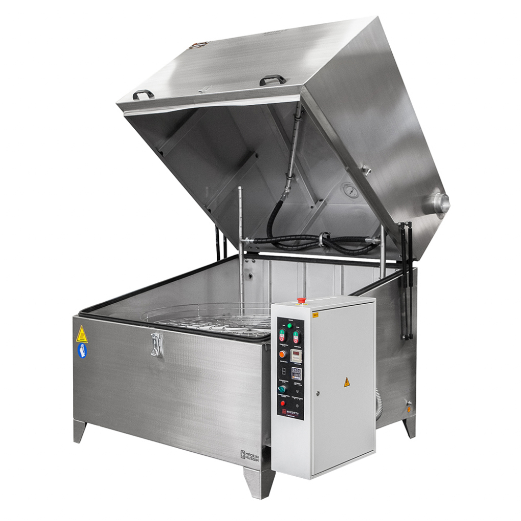 Температура и продолжительность цикла обработки задается на панели управления. Вращение корзины обеспечивает необходимое позиционирование деталей перед коллекторами. П-образная форма рамп позволяет промывать изделия сверху, снизу и сбоку в течение заданного времени. Автоматические промывочные установки серии АМ предназначены для использования со слабощелочными растворами. Для наполнения бака используется обычная водопроводная вода.