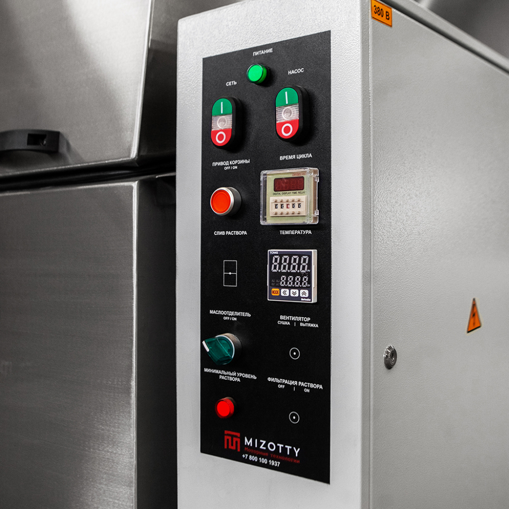Линейка комплектуется электромеханическим приводом корзины с частотой вращения 5-10 об/мин., обеспечивающим высокое качество очистки, за счет равномерной подачи моющего раствора по всей поверхности деталей.