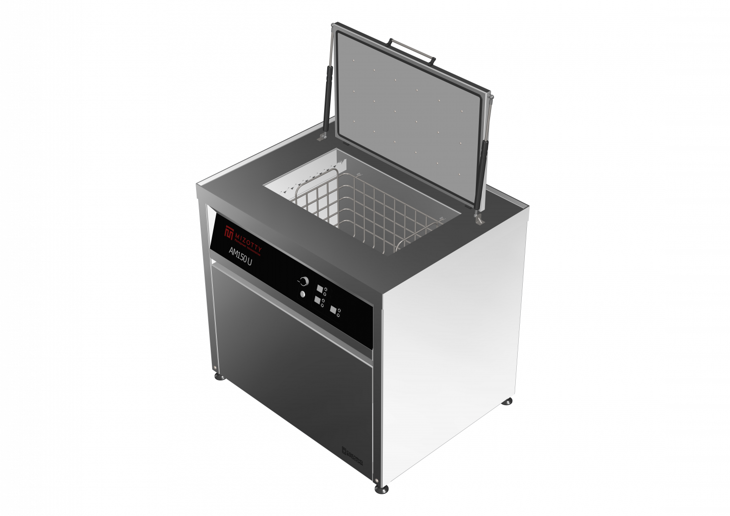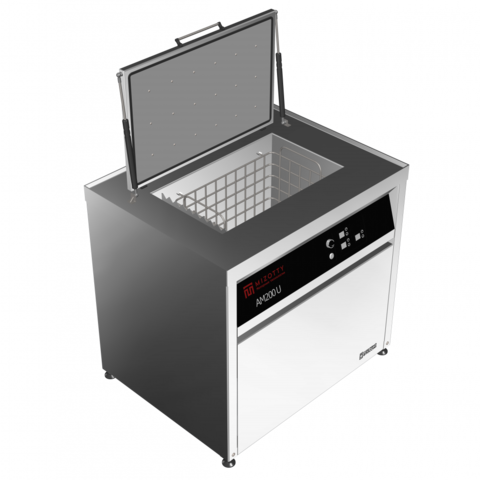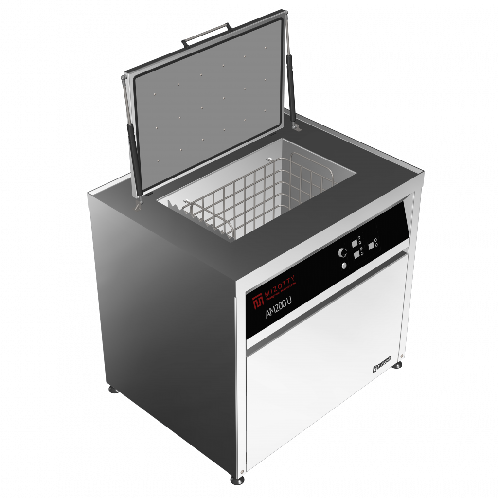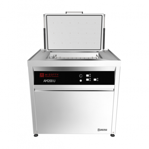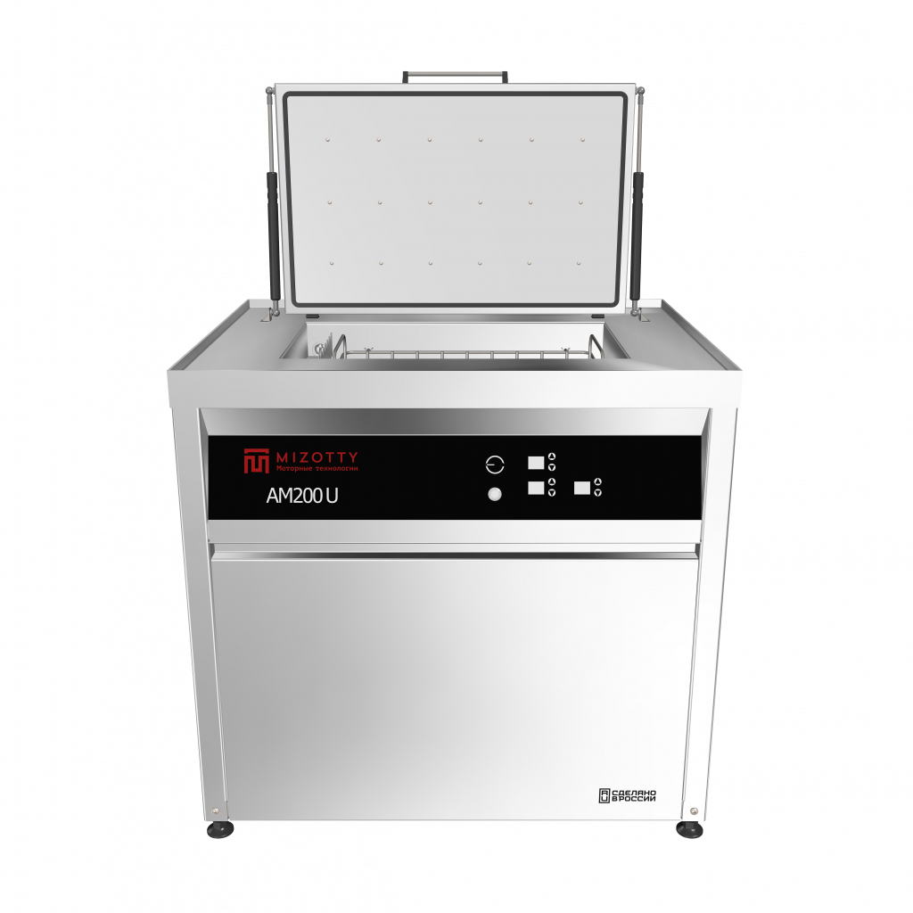 Конструкция ультразвуковой установки АМ200 U представляет собой внешний корпус, изготовленный из нержавеющей стали, на фронтальной стороне которого расположена панель управления. Оборудование устанавливается на виброопорах с возможностью регулировки по высоте. Откидная тепло-шумоизолированная крышка оснащена газлифтами для удобства оператору. В рабочей ёмкости моечной установки размещены погружные ультразвуковые излучатели, погружные ТЭНы, карман перелива, поплавковый датчик уровня и датчик температуры. Все элементы, контактирующие с моющим средством изготовлены из нержавеющей стали или материалов инертных к химическому воздействию растворов. Для загрузки обрабатываемых деталей, в комплект поставки входит корзина, также изготовленная из нержавеющей стали.