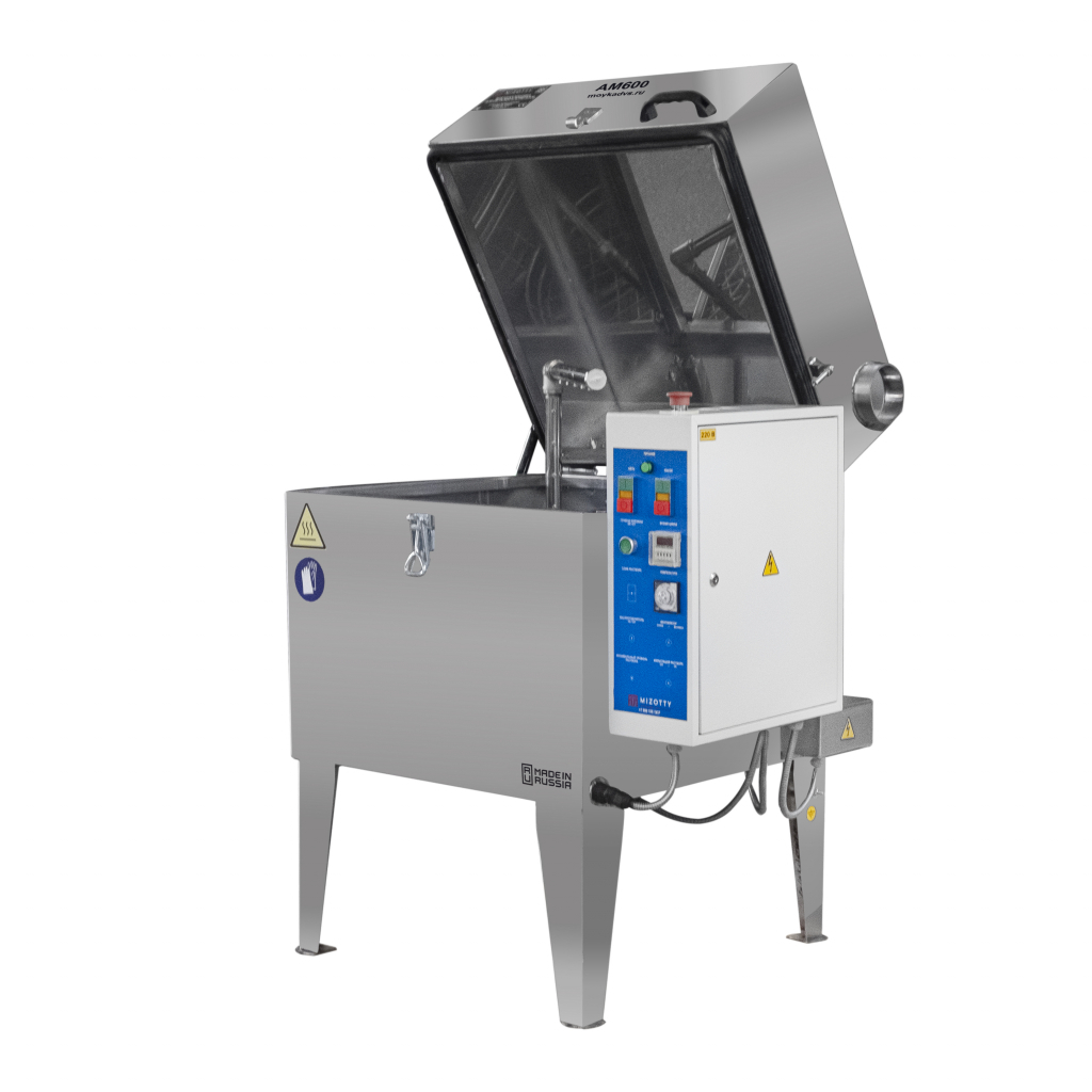 Температура и продолжительность цикла обработки задается на панели управления. Вращение корзины обеспечивает необходимое позиционирование деталей перед коллекторами. Парная П-образная форма рамп позволяет промывать изделия сверху, снизу и сбоку в течение заданного времени. Автоматические промывочные установки серии АМ предназначены для использования со слабощелочными растворами. Для наполнения бака используется обычная водопроводная вода.