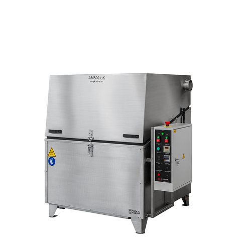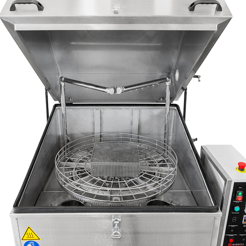 Температура и продолжительность цикла обработки задается на панели управления. Вращение корзины обеспечивает необходимое позиционирование деталей перед коллекторами. Парная П-образная форма рамп позволяет промывать изделия сверху, снизу и сбоку в течение заданного времени. Автоматические промывочные установки серии АМ предназначены для использования со слабощелочными растворами. Для наполнения бака используется обычная водопроводная вода.