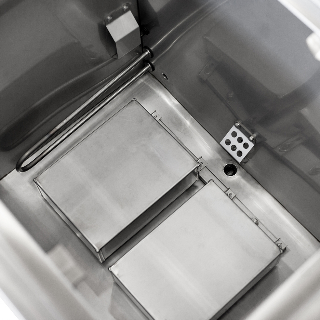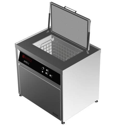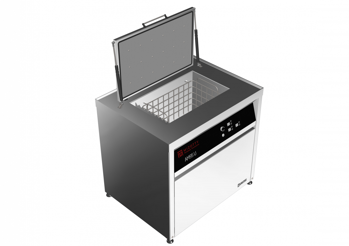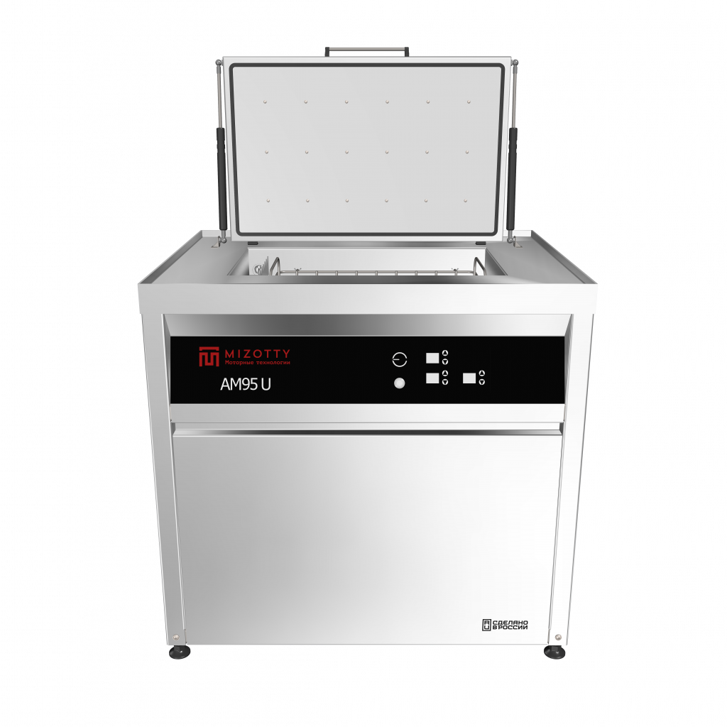Конструкция ультразвуковой установки АМ95 U представляет собой внешний корпус, изготовленный из нержавеющей стали, на фронтальной стороне которого расположена панель управления. Оборудование устанавливается на виброопорах с возможностью регулировки по высоте. Откидная тепло-шумоизолированная крышка оснащена газлифтами для удобства оператору. В рабочей ёмкости моечной установки размещены погружные ультразвуковые излучатели, погружные ТЭНы, карман перелива, поплавковый датчик уровня и датчик температуры. Все элементы, контактирующие с моющим средством изготовлены из нержавеющей стали или материалов инертных к химическому воздействию растворов. Для загрузки обрабатываемых деталей, в комплект поставки входит корзина, также изготовленная из нержавеющей стали.