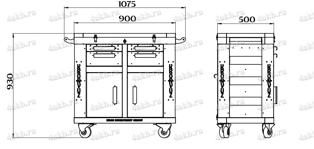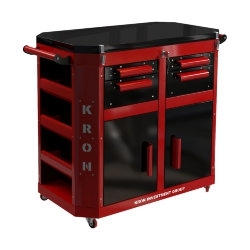 Поставляется в металлической тележке на четырех поворотных колесах. Тележка состоит из 4 ящиков и двух отсеков с дверцами. Центральный замок обеспечивает запирание как ящиков, так и дверец тележки. Под крышкой тележки имеется 2 полости с разделителями под мелкий инструмент и метизы. Закрыв крышку ее можно использовать как рабочую поверхность.