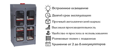 Для удобства эксплуатации в шкаф встроена лампа освещения которая полностью освещает внутреннюю часть шкафа, блогодаря чему можно работать в помещении слабо освещённом или же в темное время суток. Количество ламп освещения зависит от выбранной серии шкафа для зарядки АКБ.