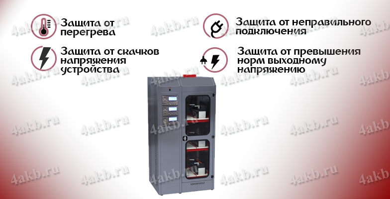 Зарядно-разрядный десульфатирующий шкаф серии Светоч-03.ЖК имеет быстродействующую защиту от неправильного подключения аккумуляторной батареи, перегрузок и короткого замыкания.