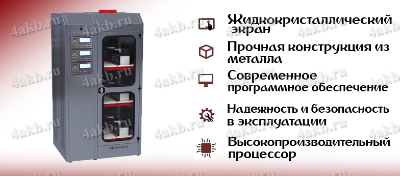 Зарядно-разрядный десульфатирующий трехъярусный шкаф серии Светоч-03.ЖК предназначен для заряда, разряда и десульфатации всех типов аккумуляторных батарей (АКБ), в том числе полностью разряженных, в автоматическом режиме с возможностью ручной регулировки параметров.