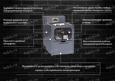 Изделие имеет в своем составе от одного до шести независимых каналов, обеспечивающих одновременное обслуживание от одного до шести АКБ. Каждый канал представляет собой высокотехнологичное импульсное зарядно-разрядное десульфатирующие устройство (ЗРУ) с микропроцессорным управлением. Для получения зарядного или разрядного тока и напряжения в данном устройстве используется высокочастотный импульсный выпрямитель, со стабилизацией выхода по току или напряжению (в зависимости от заданной программы микропроцессора). Разряд АКБ осуществляется с помощью переменной «активной» нагрузки, управляемой микропроцессором.