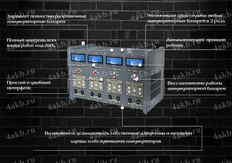 Данное изделие является надежным зарядным устройством, обеспечивающим эффективное восстановление напряжения аккумуляторных батарей, вне зависимости от их состояния, несколькими нажатиями кнопок и при своей компактности предоставляет возможность обслуживать одновременно до 4-ех аккумуляторных батарей( в зависимости от исполнения).